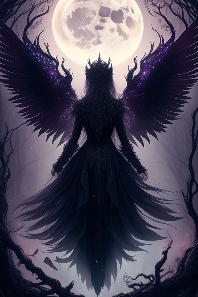 Canine Crab5 Ornate Intricate Details Beautiful Moon Goddess Neon Dark Wings Dark Forest Beautiful Face Gothic Style Hyper Realistic Fantasy Art Digital Illustration Black Pastel Moon Scene